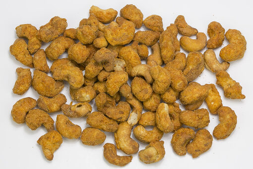 Fried cashews with a spicy coating with BBQ taste (74% cashew)